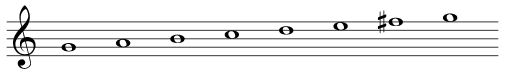 既然觉得频率差为2212221这种大调调式比较常用,那么主音为C时都使用自然音, 当主音为G也是使用大调频率差时,到第七级时候不能使用F,因为F和G差2个半音,此时要使用F右侧的黑键F♯(参看下一节变音记号)。